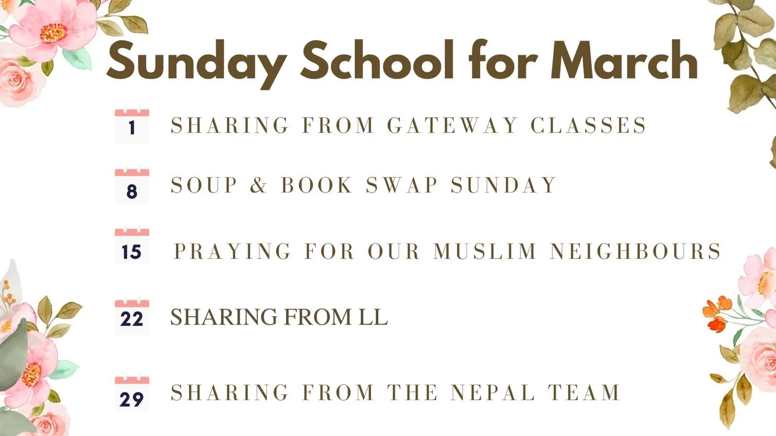 Join us in the 685 gym every Sunday after worship service for Sunday School. Classes usually start at 11:15am and run until 12:30pm. As Sunday School is in-person, there are no recordings available. For materials, please reach out directly to the Sunday School teacher to ask if they are able to share. If you have any questions, please reach out to any Teaching Ministry members.